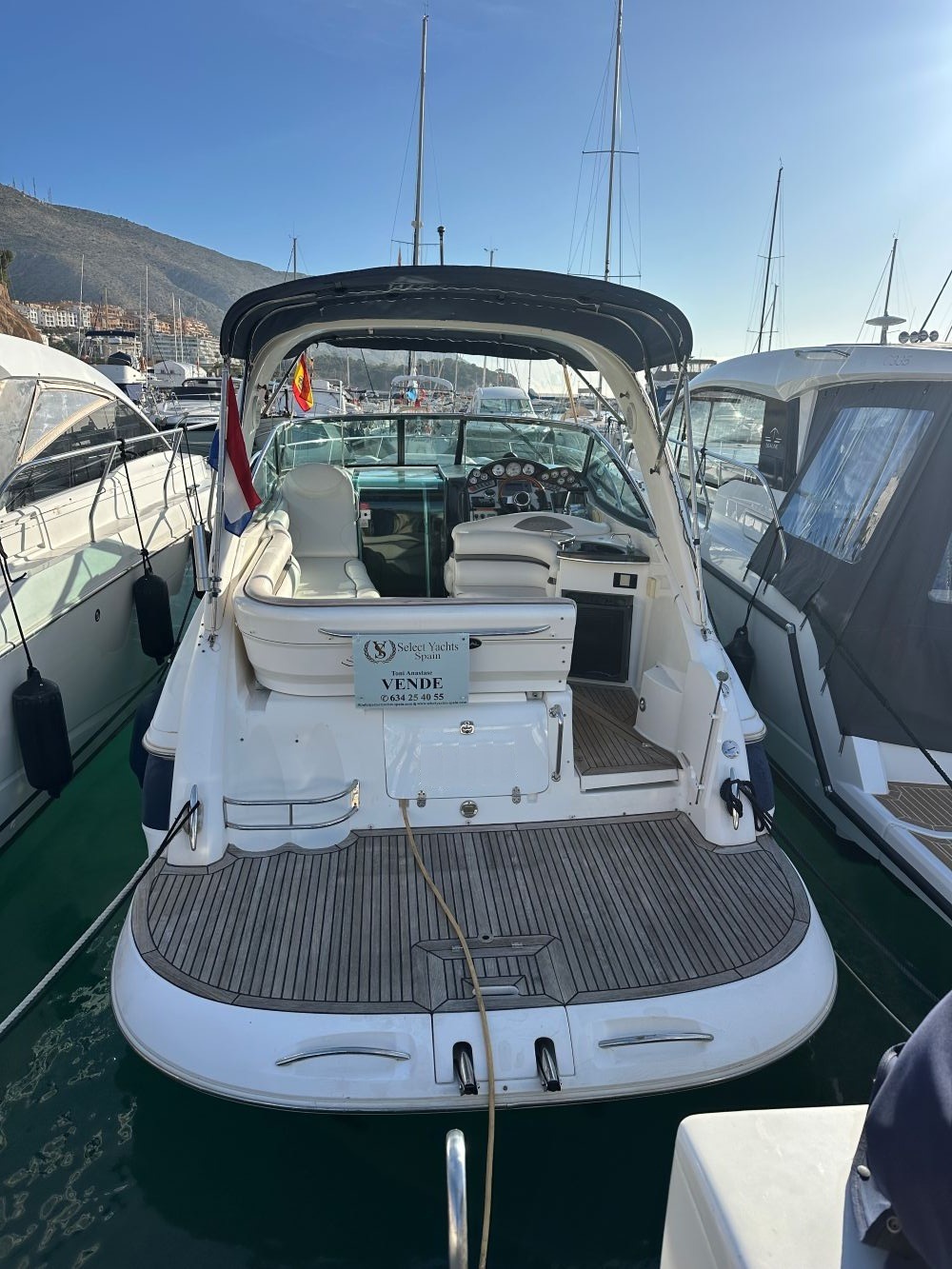 Incluye una plataforma de baño extendida de teca, un arco de radar plegable y un área de bañera con sofás en L, mesa y mueble bar con nevera.