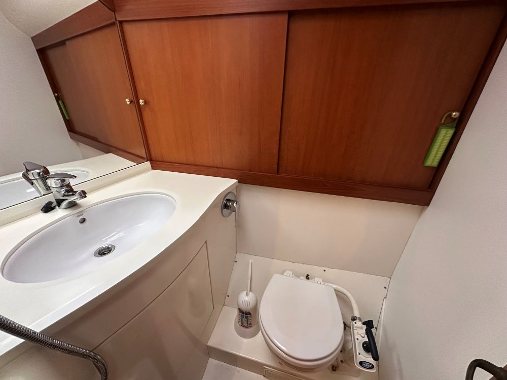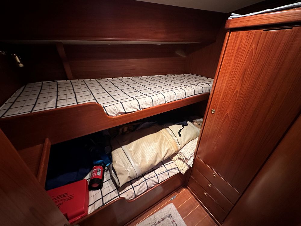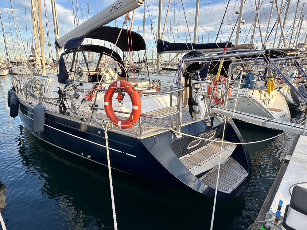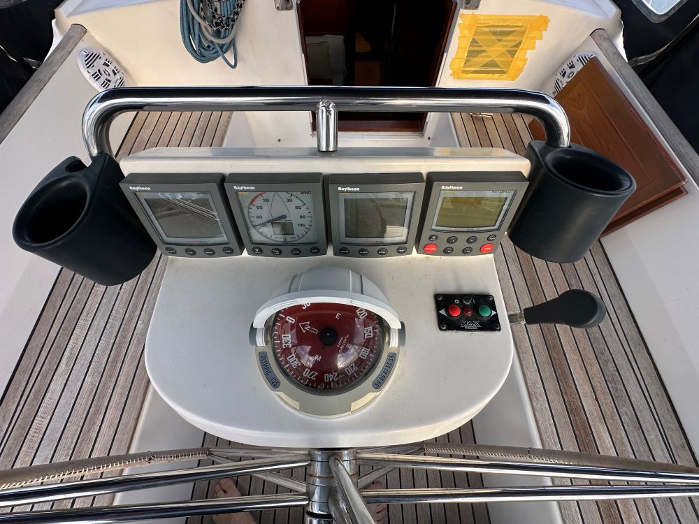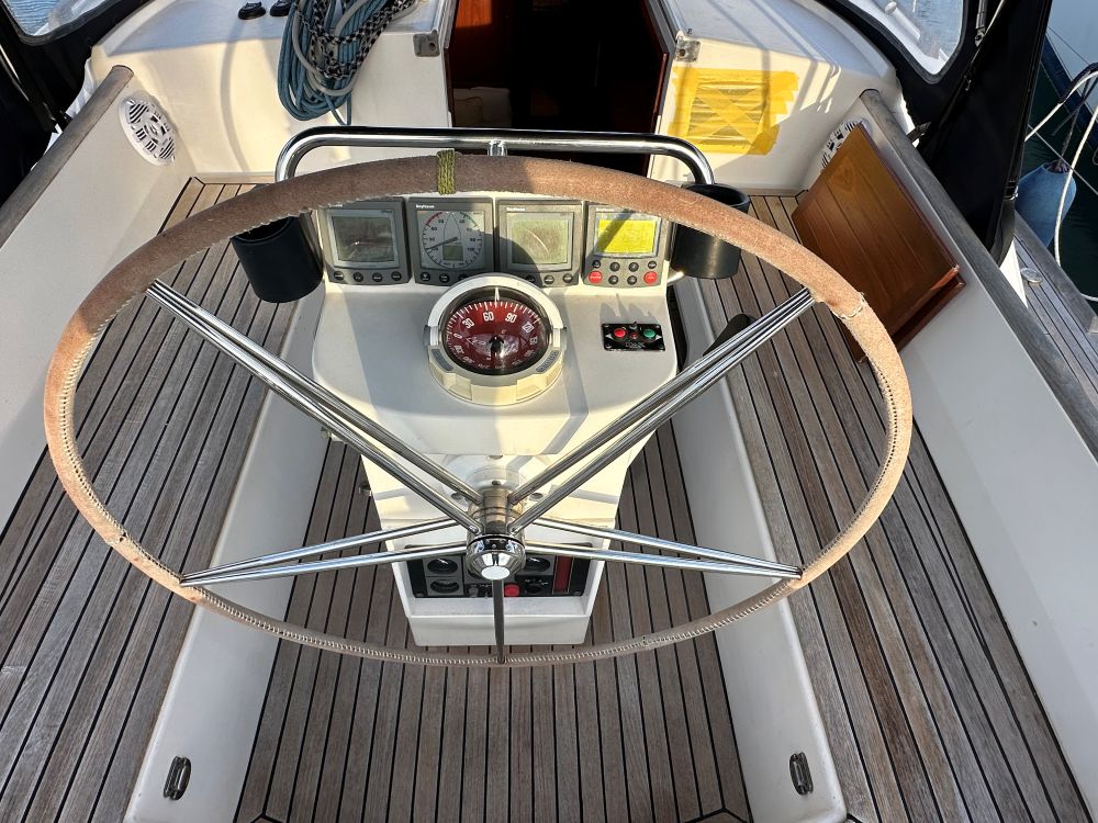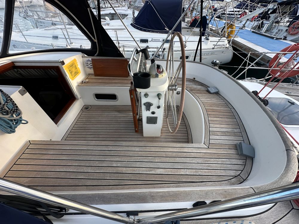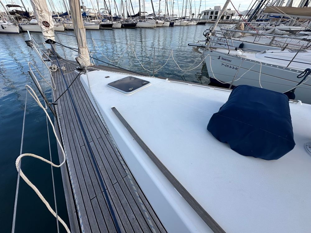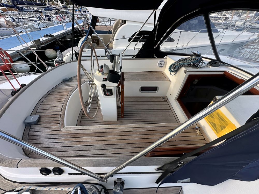 La consola central es una de las novedades en un modelo de este tamaño, la cubierta de teca y las amplias superficies disponibles para el baño garantizan un área de ocio familiar fluida. Todas las maniobras de driza (cuerdas para subir y bajar las velas) están centralizadas a los pies del mástil, y el trabajo (genoa y drizas principales) alrededor de la cabina. Todas estas operaciones pueden ser realizadas por el mismo patrón sin necesidad de la ayuda de los marineros.