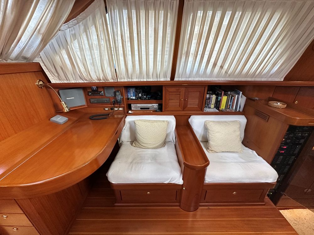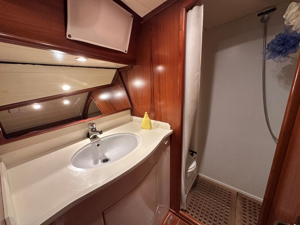 Esta cubierta, y el plan de velas, reúnen toda la experiencia del italiano Marcelo Penna, encargado por el astillero de actualizar este modelo. Los 123 metros cuadrados de velas de ceñida garantizan altas velocidades y travesías rentables. El diseño de la superestructura es especialmente afortunado. Se ha evitado la estética del autobús, logrando una silueta en la que la altura exterior de la cabina está perfectamente integrada en el diseño general del barco, mientras se logran pasillos amplios y seguros para el movimiento y la maniobra en cubierta.